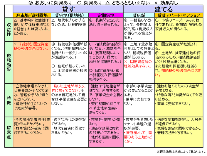 下の表では土地活用の方法ごとに収益や税務効果、特徴について比較しています。